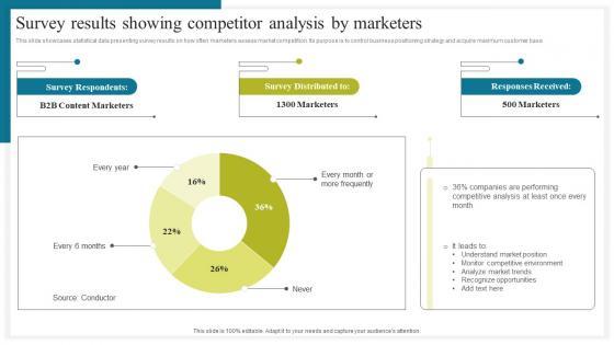 This slide showcases statistical data presenting survey results on how often marketers assess market competition. Its purpose is to control business positioning strategy and acquire maximum customer base This modern and well arranged Survey Results Showing Competitor How To Conduct Competitive Assessment Portrait Pdf provides lots of creative possibilities. It is very simple to customize and edit with the Powerpoint Software. Just drag and drop your pictures into the shapes. All facets of this template can be edited with Powerpoint no extra software is necessary. Add your own material, put your images in the places assigned for them, adjust the colors, and then you can show your slides to the world, with an animated slide included. This slide showcases statistical data presenting survey results on how often marketers assess market competition. Its purpose is to control business positioning strategy and acquire maximum customer base