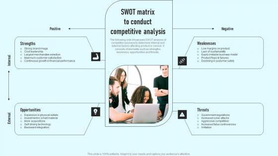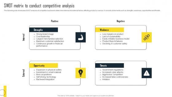The following side showcases SWOT analysis of competitor business to determine internal and external factors affecting product or service. It consists of elements such as strengths, weakness, opportunities and threats. This modern and well-arranged SWOT Matrix To Conduct Competitive Analysis Efficient Plan For Conducting Competitor Slides Pdf provides lots of creative possibilities. It is very simple to customize and edit with the Powerpoint Software. Just drag and drop your pictures into the shapes. All facets of this template can be edited with Powerpoint no extra software is necessary. Add your own material, put your images in the places assigned for them, adjust the colors, and then you can show your slides to the world, with an animated slide included. The following side showcases SWOT analysis of competitor business to determine internal and external factors affecting product or service. It consists of elements such as strengths, weakness, opportunities and threats.