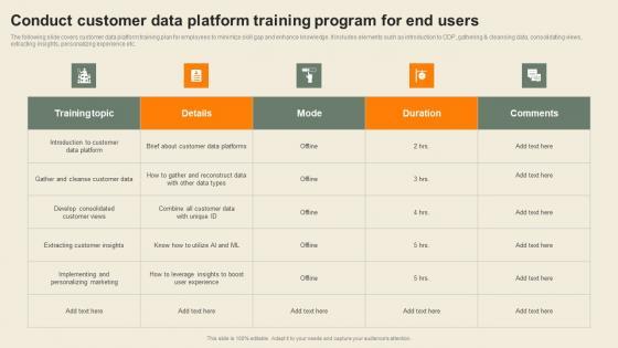 The following slide covers customer data platform training plan for employees to minimize skill gap and enhance knowledge. It includes elements such as introduction to CDP, gathering and cleansing data, consolidating views, extracting insights, personalizing experience etc. Present like a pro with Conduct Customer Data Platform Training Usability Of CDP Software Tool Background Pdf Create beautiful presentations together with your team, using our easy-to-use presentation slides. Share your ideas in real-time and make changes on the fly by downloading our templates. So whether you are in the office, on the go, or in a remote location, you can stay in sync with your team and present your ideas with confidence. With Slidegeeks presentation got a whole lot easier. Grab these presentations today. The following slide covers customer data platform training plan for employees to minimize skill gap and enhance knowledge. It includes elements such as introduction to CDP, gathering and cleansing data, consolidating views, extracting insights, personalizing experience etc.