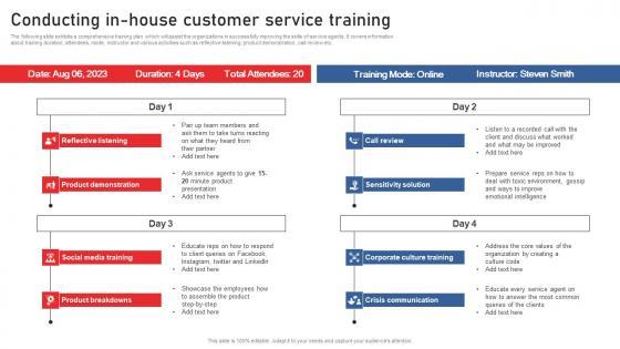 The following slide exhibits a comprehensive training plan which will assist the organizations in successfully improving the skills of service agents. It covers information about training duration, attendees, mode, instructor and various activities such as reflective listening, product demonstration, call review etc. From laying roadmaps to briefing everything in detail, our templates are perfect for you. You can set the stage with your presentation slides. All you have to do is download these easy-to-edit and customizable templates. Conducting In House Customer Service Training Using Red Ocean Strategies Topics Pdf will help you deliver an outstanding performance that everyone would remember and praise you for. Do download this presentation today. The following slide exhibits a comprehensive training plan which will assist the organizations in successfully improving the skills of service agents. It covers information about training duration, attendees, mode, instructor and various activities such as reflective listening, product demonstration, call review etc.
