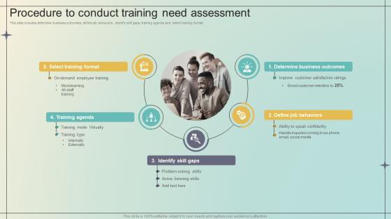 This slide includes determine business outcomes, define job behaviors, identify skill gaps, training agenda and select training format. Coming up with a presentation necessitates that the majority of the effort goes into the content and the message you intend to convey. The visuals of a PowerPoint presentation can only be effective if it supplements and supports the story that is being told. Keeping this in mind our experts created Immersive Training For Practical Procedure To Conduct Training Need Assessment DTE SS V to reduce the time that goes into designing the presentation. This way, you can concentrate on the message while our designers take care of providing you with the right template for the situation. This slide includes determine business outcomes, define job behaviors, identify skill gaps, training agenda and select training format.