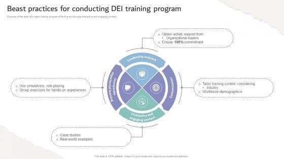Purpose of this slide is to make training program effective and develop interactive and engaging content. Create an editable Inclusive Workplace Training Program Beast Practices For Conducting Dei Training Program DTE SS V that communicates your idea and engages your audience. Whether you are presenting a business or an educational presentation, pre-designed presentation templates help save time. Inclusive Workplace Training Program Beast Practices For Conducting Dei Training Program DTE SS V is highly customizable and very easy to edit, covering many different styles from creative to business presentations. Slidegeeks has creative team members who have crafted amazing templates. So, go and get them without any delay. Purpose of this slide is to make training program effective and develop interactive and engaging content.
