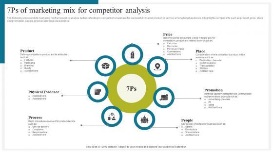 The following slide exhibits marketing mix framework to analyze factors affecting in competitors business for successfully market product or service among target audience. It highlights components such as product, price, place and promotion, people, process and physical evidence. Find a pre designed and impeccable 7Ps Of Marketing Mix For How To Conduct Competitive Assessment Information Pdf. The templates can ace your presentation without additional effort. You can download these easy to edit presentation templates to make your presentation stand out from others. So, what are you waiting for Download the template from Slidegeeks today and give a unique touch to your presentation. The following slide exhibits marketing mix framework to analyze factors affecting in competitors business for successfully market product or service among target audience. It highlights components such as product, price, place and promotion, people, process and physical evidence.