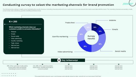The following slide outlines in-depth survey highlighting the results of various marketing channels preferred by our customers to consume relevant information associated with the brand. The marketing channels are website, emails, social media, video advertising, guerilla marketing and trade shows. Here you can discover an assortment of the finest PowerPoint and Google Slides templates. With these templates, you can create presentations for a variety of purposes while simultaneously providing your audience with an eye catching visual experience. Download Conducting Survey To Select The Marketing Channels For Brand Promotion Template PDF to deliver an impeccable presentation. These templates will make your job of preparing presentations much quicker, yet still, maintain a high level of quality. Slidegeeks has experienced researchers who prepare these templates and write high quality content for you. Later on, you can personalize the content by editing the Conducting Survey To Select The Marketing Channels For Brand Promotion Template PDF.