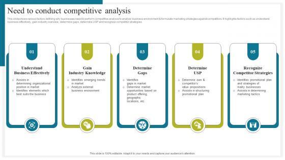This slideshows various factors defining why businesses need to perform competitive analysis to analyze business environment and formulate marketing strategies against competitors. It highlights factors such as understand business effectively, gain industry overview, determine gaps, determine USP and recognize competitor strategies. Slidegeeks is one of the best resources for PowerPoint templates. You can download easily and regulate Need To Conduct Competitive Analysis How To Conduct Competitive Assessment Portrait Pdf for your personal presentations from our wonderful collection. A few clicks is all it takes to discover and get the most relevant and appropriate templates. Use our Templates to add a unique zing and appeal to your presentation and meetings. All the slides are easy to edit and you can use them even for advertisement purposes. This slideshows various factors defining why businesses need to perform competitive analysis to analyze business environment and formulate marketing strategies against competitors. It highlights factors such as understand business effectively, gain industry overview, determine gaps, determine USP and recognize competitor strategies.