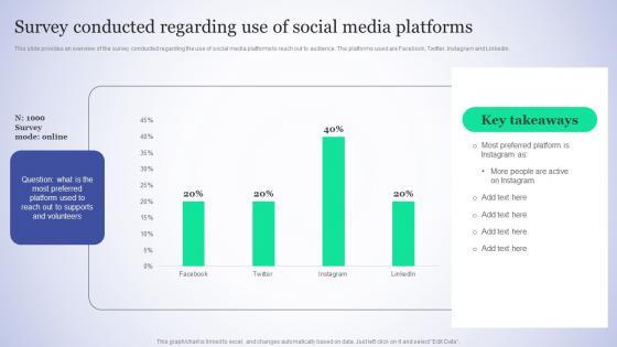 This slide provides an overview of the survey conducted regarding the use of social media platforms to reach out to audience. The platforms used are Facebook, Twitter, Instagram and Linkedin. Present like a pro with Survey Conducted Regarding Use Charitable Social Media Advertising Background Pdf Create beautiful presentations together with your team, using our easy-to-use presentation slides. Share your ideas in real-time and make changes on the fly by downloading our templates. So whether you are in the office, on the go, or in a remote location, you can stay in sync with your team and present your ideas with confidence. With Slidegeeks presentation got a whole lot easier. Grab these presentations today. This slide provides an overview of the survey conducted regarding the use of social media platforms to reach out to audience. The platforms used are Facebook, Twitter, Instagram and Linkedin.