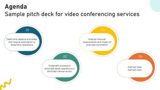 Find a pre-designed and impeccable Agenda Sample Pitch Deck For Video Conferencing Services Ppt Presentation. The templates can ace your presentation without additional effort. You can download these easy-to-edit presentation templates to make your presentation stand out from others. So, what are you waiting for Download the template from Slidegeeks today and give a unique touch to your presentation. Our Agenda Sample Pitch Deck For Video Conferencing Services Ppt Presentation are topically designed to provide an attractive backdrop to any subject. Use them to look like a presentation pro.