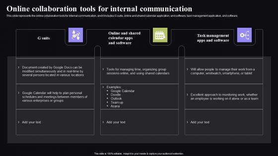This slide represents the online collaboration tools for internal communication, and it includes G suite, online and shared calendar application, and software, task management application, and software. This modern and well-arranged Online Collaboration Tools For Internal Communication Video Conferencing In Corporate Diagrams Pdf provides lots of creative possibilities. It is very simple to customize and edit with the Powerpoint Software. Just drag and drop your pictures into the shapes. All facets of this template can be edited with Powerpoint no extra software is necessary. Add your own material, put your images in the places assigned for them, adjust the colors, and then you can show your slides to the world, with an animated slide included. This slide represents the online collaboration tools for internal communication, and it includes G suite, online and shared calendar application, and software, task management application, and software.