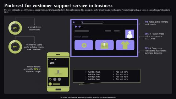 This slide outlines the use of Pinterest as a social media customer support platform. It covers the details of the people who prefer to learn visually, monthly active Pinners, the percentage of online shopping through Pinterest, and so on. The best PPT templates are a great way to save time, energy, and resources. Slidegeeks have 100 percent editable powerpoint slides making them incredibly versatile. With these quality presentation templates, you can create a captivating and memorable presentation by combining visually appealing slides and effectively communicating your message. Download Pinterest For Customer Support Service In Business Video Conferencing In Corporate Icons Pdf from Slidegeeks and deliver a wonderful presentation. This slide outlines the use of Pinterest as a social media customer support platform. It covers the details of the people who prefer to learn visually, monthly active Pinners, the percentage of online shopping through Pinterest, and so on.