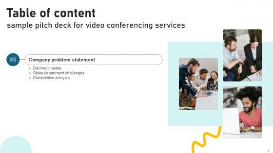 Slidegeeks has constructed Table Of Content Sample Pitch Deck For Video Conferencing Services Ppt Sample after conducting extensive research and examination. These presentation templates are constantly being generated and modified based on user preferences and critiques from editors. Here, you will find the most attractive templates for a range of purposes while taking into account ratings and remarks from users regarding the content. This is an excellent jumping-off point to explore our content and will give new users an insight into our top-notch PowerPoint Templates. Our Table Of Content Sample Pitch Deck For Video Conferencing Services Ppt Sample are topically designed to provide an attractive backdrop to any subject. Use them to look like a presentation pro.