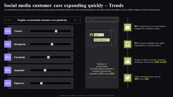 This slide depicts how social media customer care is growing quickly by showing the latest trends. It also includes the popular social media customer care platform, such as Twitter, Instagram, Facebook, and snap chat. Slidegeeks has constructed Social Media Customer Care Expanding Quickly Trends Video Conferencing In Corporate Slides Pdf after conducting extensive research and examination. These presentation templates are constantly being generated and modified based on user preferences and critiques from editors. Here, you will find the most attractive templates for a range of purposes while taking into account ratings and remarks from users regarding the content. This is an excellent jumping-off point to explore our content and will give new users an insight into our top-notch PowerPoint Templates. This slide depicts how social media customer care is growing quickly by showing the latest trends. It also includes the popular social media customer care platform, such as Twitter, Instagram, Facebook, and snap chat.