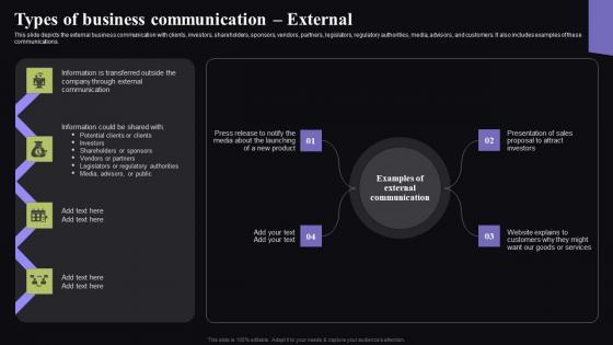 This slide depicts the external business communication with clients, investors, shareholders, sponsors, vendors, partners, legislators, regulatory authorities, media, advisors, and customers. It also includes examples of these communications. Boost your pitch with our creative Types Of Business Communication External Video Conferencing In Corporate Clipart Pdf. Deliver an awe-inspiring pitch that will mesmerize everyone. Using these presentation templates you will surely catch everyones attention. You can browse the ppts collection on our website. We have researchers who are experts at creating the right content for the templates. So you do not have to invest time in any additional work. Just grab the template now and use them. This slide depicts the external business communication with clients, investors, shareholders, sponsors, vendors, partners, legislators, regulatory authorities, media, advisors, and customers. It also includes examples of these communications.