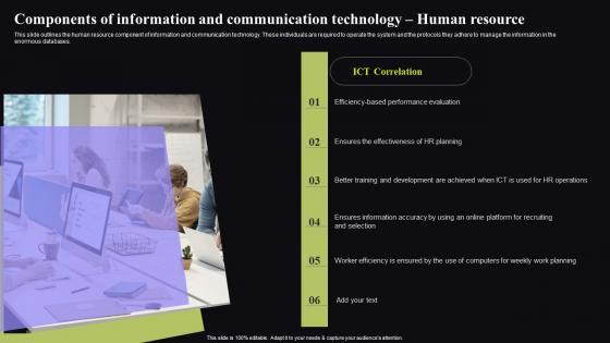 This slide outlines the human resource component of information and communication technology. These individuals are required to operate the system and the protocols they adhere to manage the information in the enormous databases. Slidegeeks is here to make your presentations a breeze with Video Conferencing In Corporate Components Of Information Icons Pdf With our easy-to-use and customizable templates, you can focus on delivering your ideas rather than worrying about formatting. With a variety of designs to choose from, you are sure to find one that suits your needs. And with animations and unique photos, illustrations, and fonts, you can make your presentation pop. So whether you are giving a sales pitch or presenting to the board, make sure to check out Slidegeeks first. This slide outlines the human resource component of information and communication technology. These individuals are required to operate the system and the protocols they adhere to manage the information in the enormous databases.