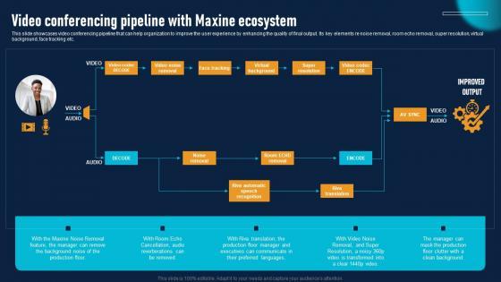 This slide showcases video conferencing pipeline that can help organization to improve the user experience by enhancing the quality of final output. Its key elements re noise removal, room echo removal, super resolution, virtual background, face tracking etc. Coming up with a presentation necessitates that the majority of the effort goes into the content and the message you intend to convey. The visuals of a PowerPoint presentation can only be effective if it supplements and supports the story that is being told. Keeping this in mind our experts created Video Conferencing Pipeline NVIDIA AI To Improve Virtual Communication Experience Slides Pdf to reduce the time that goes into designing the presentation. This way, you can concentrate on the message while our designers take care of providing you with the right template for the situation. This slide showcases video conferencing pipeline that can help organization to improve the user experience by enhancing the quality of final output. Its key elements re noise removal, room echo removal, super resolution, virtual background, face tracking etc.