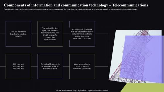 This slide talks about the telecommunications that connect hardware to form a network. The network can be established through wires, ethernet cables, fiber optics, or wireless technologies like wifi. Present like a pro with Y3 Video Conferencing In Corporate Components Of Information And Communication Microsoft Pdf Create beautiful presentations together with your team, using our easy-to-use presentation slides. Share your ideas in real-time and make changes on the fly by downloading our templates. So whether you are in the office, on the go, or in a remote location, you can stay in sync with your team and present your ideas with confidence. With Slidegeeks presentation got a whole lot easier. Grab these presentations today. This slide talks about the telecommunications that connect hardware to form a network. The network can be established through wires, ethernet cables, fiber optics, or wireless technologies like wifi.