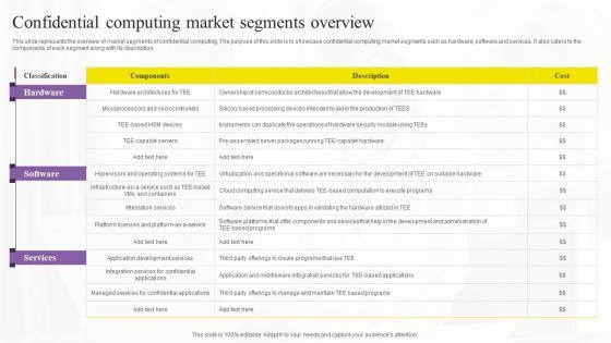 This slide represents the overview of market segments of confidential computing. The purpose of this slide is to showcase confidential computing market segments such as hardware, software and services. It also caters to the components of each segment along with its description. his modern and well-arranged Confidential Computing Market Segments Overview Secure Computing Framework Structure Pdf provides lots of creative possibilities. It is very simple to customize and edit with the Powerpoint Software. Just drag and drop your pictures into the shapes. All facets of this template can be edited with Powerpoint, no extra software is necessary. Add your own material, put your images in the places assigned for them, adjust the colors, and then you can show your slides to the world, with an animated slide included. This slide represents the overview of market segments of confidential computing. The purpose of this slide is to showcase confidential computing market segments such as hardware, software and services. It also caters to the components of each segment along with its description.