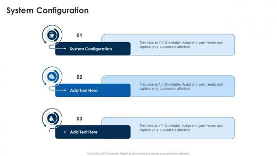 Presenting our innovatively designed set of slides titled System Configuration In Powerpoint And Google Slides Cpb. This completely editable PowerPoint graphic exhibits System Configuration that will help you convey the message impactfully. It can be accessed with Google Slides and is available in both standard screen and widescreen aspect ratios. Apart from this, you can download this well structured PowerPoint template design in different formats like PDF, JPG, and PNG. So, click the download button now to gain full access to this PPT design. Our System Configuration In Powerpoint And Google Slides Cpb are topically designed to provide an attractive backdrop to any subject. Use them to look like a presentation pro.