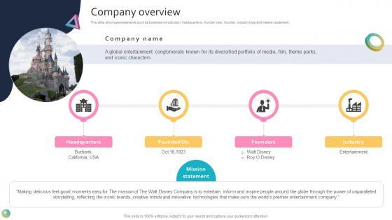 This slide showcases elements such as business introduction, headquarters, founder year, founder, industry type and mission statement. Boost your pitch with our creative Company Overview Global Entertainment Conglomerate Business Model BMC SS V. Deliver an awe-inspiring pitch that will mesmerize everyone. Using these presentation templates you will surely catch everyones attention. You can browse the ppts collection on our website. We have researchers who are experts at creating the right content for the templates. So you do not have to invest time in any additional work. Just grab the template now and use them. This slide showcases elements such as business introduction, headquarters, founder year, founder, industry type and mission statement.