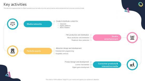 This slide showcases activities for efficient operations such as media networks, parks and resorts, studio entertainment and consumer products and media. Get a simple yet stunning designed Key Activities Global Entertainment Conglomerate Business Model BMC SS V. It is the best one to establish the tone in your meetings. It is an excellent way to make your presentations highly effective. So, download this PPT today from Slidegeeks and see the positive impacts. Our easy-to-edit Key Activities Global Entertainment Conglomerate Business Model BMC SS V can be your go-to option for all upcoming conferences and meetings. So, what are you waiting for Grab this template today. This slide showcases activities for efficient operations such as media networks, parks and resorts, studio entertainment and consumer products and media.