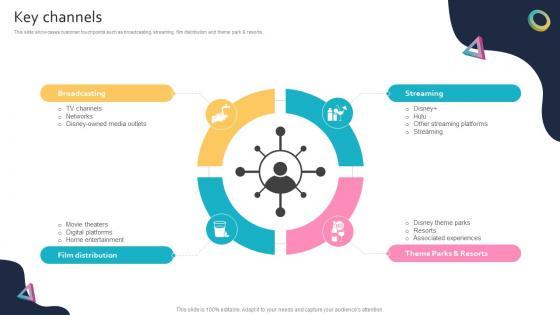 This slide showcases customer touchpoints such as broadcasting, streaming, film distribution and theme park and resorts. From laying roadmaps to briefing everything in detail, our templates are perfect for you. You can set the stage with your presentation slides. All you have to do is download these easy-to-edit and customizable templates. Key Channels Global Entertainment Conglomerate Business Model BMC SS V will help you deliver an outstanding performance that everyone would remember and praise you for. Do download this presentation today. This slide showcases customer touchpoints such as broadcasting, streaming, film distribution and theme park and resorts.