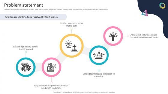 This slide showcases challenges such as limited family friendly content, fragmented animated industry, theme park innovation, technical innovation and cultural impact. Whether you have daily or monthly meetings, a brilliant presentation is necessary. Problem Statement Global Entertainment Conglomerate Business Model BMC SS V can be your best option for delivering a presentation. Represent everything in detail using Problem Statement Global Entertainment Conglomerate Business Model BMC SS V and make yourself stand out in meetings. The template is versatile and follows a structure that will cater to your requirements. All the templates prepared by Slidegeeks are easy to download and edit. Our research experts have taken care of the corporate themes as well. So, give it a try and see the results. This slide showcases challenges such as limited family friendly content, fragmented animated industry, theme park innovation, technical innovation and cultural impact.