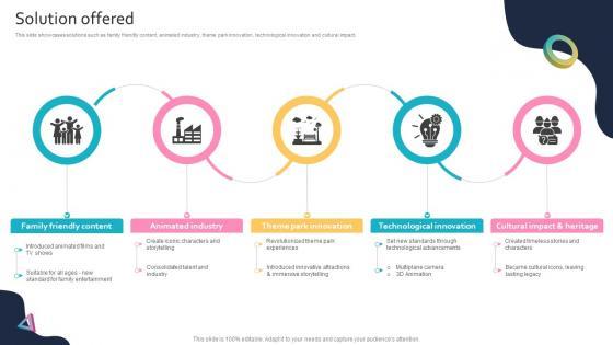 This slide showcases solutions such as family friendly content, animated industry, theme park innovation, technological innovation and cultural impact. If your project calls for a presentation, then Slidegeeks is your go-to partner because we have professionally designed, easy-to-edit templates that are perfect for any presentation. After downloading, you can easily edit Solution Offered Global Entertainment Conglomerate Business Model BMC SS V and make the changes accordingly. You can rearrange slides or fill them with different images. Check out all the handy templates This slide showcases solutions such as family friendly content, animated industry, theme park innovation, technological innovation and cultural impact.