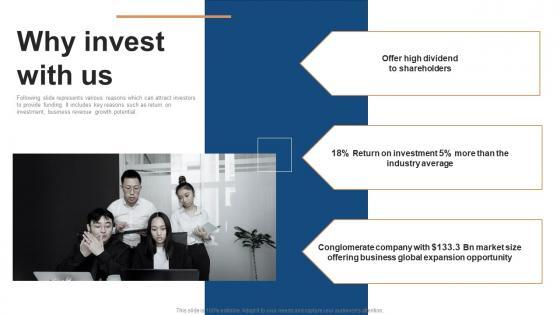 Following slide represents various reasons which can attract investors to provide funding. It includes key reasons such as return on investment, business revenue growth potential. Explore a selection of the finest Why Invest With Us Conglomerate Company Fund Raising Pitch Deck Portrait Pdf here. With a plethora of professionally designed and pre-made slide templates, you can quickly and easily find the right one for your upcoming presentation. You can use our Why Invest With Us Conglomerate Company Fund Raising Pitch Deck Portrait Pdf to effectively convey your message to a wider audience. Slidegeeks has done a lot of research before preparing these presentation templates. The content can be personalized and the slides are highly editable. Grab templates today from Slidegeeks. Following slide represents various reasons which can attract investors to provide funding. It includes key reasons such as return on investment, business revenue growth potential.