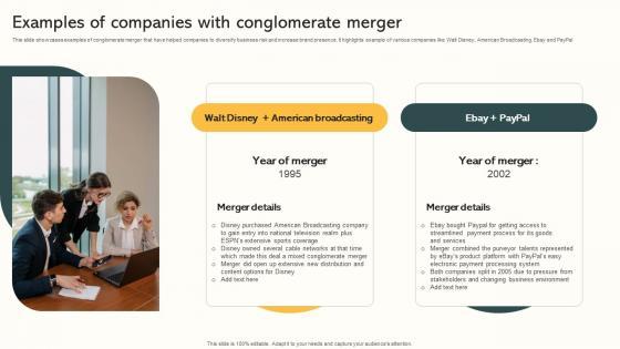 This slide showcases examples of conglomerate merger that have helped companies to diversify business risk and increase brand presence. It highlights example of various companies like Walt Disney, American Broadcasting, Ebay and PayPal. Here you can discover an assortment of the finest PowerPoint and Google Slides templates. With these templates, you can create presentations for a variety of purposes while simultaneously providing your audience with an eye-catching visual experience. Download Examples Of Companies With Conglomerate Merger Market Expansion Through Mockup Pdf to deliver an impeccable presentation. These templates will make your job of preparing presentations much quicker, yet still, maintain a high level of quality. Slidegeeks has experienced researchers who prepare these templates and write high-quality content for you. Later on, you can personalize the content by editing the Examples Of Companies With Conglomerate Merger Market Expansion Through Mockup Pdf This slide showcases examples of conglomerate merger that have helped companies to diversify business risk and increase brand presence. It highlights example of various companies like Walt Disney, American Broadcasting, Ebay and PayPal.