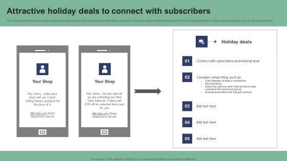 This slide represents the campaign organized by enterprise to build strong relationships with subscribers. It includes details related to best practices for conducting effective holiday deals campaign such as sell experience etc. Create an editable Attractive Holiday Deals To Connect With Subscribers Text Message Marketing Strategies Summary Pdf that communicates your idea and engages your audience. Whether you are presenting a business or an educational presentation, pre-designed presentation templates help save time. Attractive Holiday Deals To Connect With Subscribers Text Message Marketing Strategies Summary Pdf is highly customizable and very easy to edit, covering many different styles from creative to business presentations. Slidegeeks has creative team members who have crafted amazing templates. So, go and get them without any delay. This slide represents the campaign organized by enterprise to build strong relationships with subscribers. It includes details related to best practices for conducting effective holiday deals campaign such as sell experience etc.