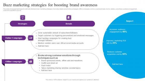 This slide showcases techniques to optimally introduce buzz marketing strategies. It provides details about online campaigns, offline campaigns, rumors, scarcity principle, humor, details, subscribers, audience engagement, customer acquisition cost, etc. qFind highly impressive Buzz Marketing Strategies Boosting Centric Marketing To Enhance Brand Connections Demonstration Pdf on Slidegeeks to deliver a meaningful presentation. You can save an ample amount of time using these presentation templates. No need to worry to prepare everything from scratch because Slidegeeks experts have already done a huge research and work for you. You need to download Buzz Marketing Strategies Boosting Centric Marketing To Enhance Brand Connections Demonstration Pdf for your upcoming presentation. All the presentation templates are 100 percent editable and you can change the color and personalize the content accordingly. Download now This slide showcases techniques to optimally introduce buzz marketing strategies. It provides details about online campaigns, offline campaigns, rumors, scarcity principle, humor, details, subscribers, audience engagement, customer acquisition cost, etc.