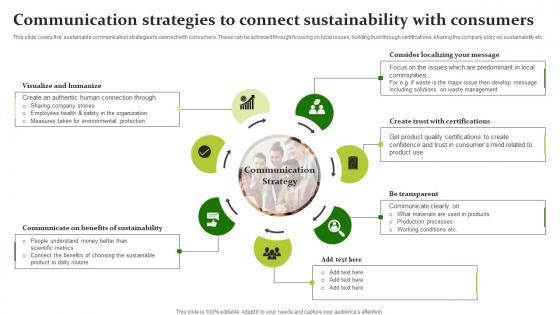 This slide covers five sustainable communication strategies to connect with consumers. These can be achieved through focusing on local issues, building trust through certifications, sharing the company story on sustainability etc. Create an editable Environmental Marketing Communication Strategies To Connect Sustainability With Consumers Graphics PDF that communicates your idea and engages your audience. Whether youre presenting a business or an educational presentation, pre designed presentation templates help save time. Environmental Marketing Communication Strategies To Connect Sustainability With Consumers Graphics PDF is highly customizable and very easy to edit, covering many different styles from creative to business presentations. Slidegeeks has creative team members who have crafted amazing templates. So, go and get them without any delay.