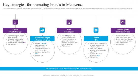 This slide shows major strategies for promoting brands in Metaverse. It provides details about brand strategy, employee adoption program, tech experts, non fungible tokens NFTs, game launch, crypto, discount coupons, etc. Do you have to make sure that everyone on your team knows about any specific topic I yes, then you should give Key Strategies For Promoting Centric Marketing To Enhance Brand Connections Background Pdf a try. Our experts have put a lot of knowledge and effort into creating this impeccable Key Strategies For Promoting Centric Marketing To Enhance Brand Connections Background Pdf. You can use this template for your upcoming presentations, as the slides are perfect to represent even the tiniest detail. You can download these templates from the Slidegeeks website and these are easy to edit. So grab these today This slide shows major strategies for promoting brands in Metaverse. It provides details about brand strategy, employee adoption program, tech experts, non fungible tokens NFTs, game launch, crypto, discount coupons, etc.