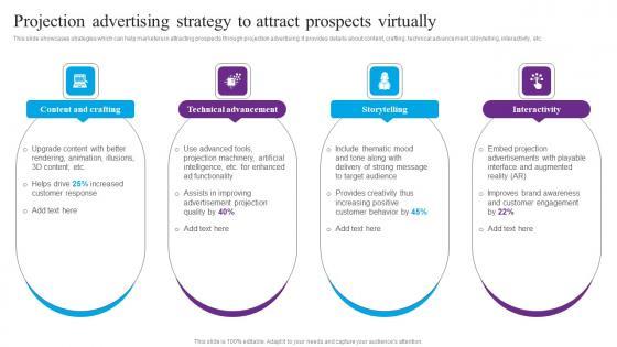 This slide showcases strategies which can help marketers in attracting prospects through projection advertising. It provides details about content, crafting, technical advancement, storytelling, interactivity, etc. Retrieve professionally designed Projection Advertising Strategy Centric Marketing To Enhance Brand Connections Guidelines Pdf to effectively convey your message and captivate your listeners. Save time by selecting pre made slideshows that are appropriate for various topics, from business to educational purposes. These themes come in many different styles, from creative to corporate, and all of them are easily adjustable and can be edited quickly. Access them as PowerPoint templates or as Google Slides themes. You do not have to go on a hunt for the perfect presentation because Slidegeeks got you covered from everywhere. This slide showcases strategies which can help marketers in attracting prospects through projection advertising. It provides details about content, crafting, technical advancement, storytelling, interactivity, etc.