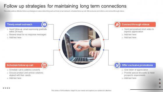 This slide outlines effective follow-up strategies in sales networking such as timely email outreach, schedule follow up call, offer exclusive promotions, and connect through videos. This modern and well-arranged Trade Event Tactics To Boost Follow Up Strategies For Maintaining Long Term Connections SA SS V provides lots of creative possibilities. It is very simple to customize and edit with the Powerpoint Software. Just drag and drop your pictures into the shapes. All facets of this template can be edited with Powerpoint, no extra software is necessary. Add your own material, put your images in the places assigned for them, adjust the colors, and then you can show your slides to the world, with an animated slide included. This slide outlines effective follow-up strategies in sales networking such as timely email outreach, schedule follow up call, offer exclusive promotions, and connect through videos.