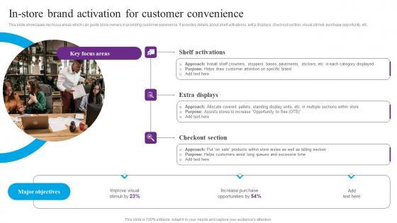 This slide showcases key focus areas which can guide store owners in providing customer experience. It provides details about shelf activations, extra displays, checkout section, visual stimuli, purchase opportunity, etc. Want to ace your presentation in front of a live audience Our In Store Brand Activation Customer Centric Marketing To Enhance Brand Connect Information Pdf can help you do that by engaging all the users towards you. Slidegeeks experts have put their efforts and expertise into creating these impeccable powerpoint presentations so that you can communicate your ideas clearly. Moreover, all the templates are customizable, and easy to edit and downloadable. Use these for both personal and commercial use. This slide showcases key focus areas which can guide store owners in providing customer experience. It provides details about shelf activations, extra displays, checkout section, visual stimuli, purchase opportunity, etc.