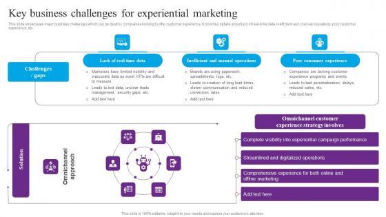 This slide showcases major business challenges which can be dealt by companies looking to offer customer experience. It provides details about lack of real time data, inefficient and manual operations, poor customer experience, etc. There are so many reasons you need a Key Business Challenges Centric Marketing To Enhance Brand Connections Topics Pdf. The first reason is you can not spend time making everything from scratch, Thus, Slidegeeks has made presentation templates for you too. You can easily download these templates from our website easily. This slide showcases major business challenges which can be dealt by companies looking to offer customer experience. It provides details about lack of real time data, inefficient and manual operations, poor customer experience, etc.