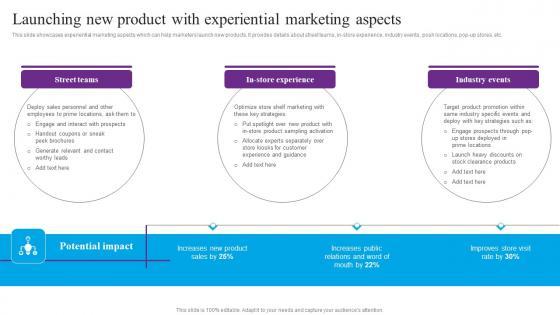 This slide showcases experiential marketing aspects which can help marketers launch new products. It provides details about street teams, in store experience, industry events, posh locations, pop up stores, etc. From laying roadmaps to briefing everything in detail, our templates are perfect for you. You can set the stage with your presentation slides. All you have to do is download these easy to edit and customizable templates. Launching New Product Centric Marketing To Enhance Brand Connections Microsoft Pdf will help you deliver an outstanding performance that everyone would remember and praise you for. Do download this presentation today. This slide showcases experiential marketing aspects which can help marketers launch new products. It provides details about street teams, in store experience, industry events, posh locations, pop up stores, etc.