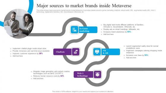 This slide shows major sources to market brands inside Metaverse. It provides details about in game marketing, chatbots, virtual reality VR, augmented reality AR, Web 3 technology, digital land, Sandbox, OM, Decentraland, Otherside, etc. Slidegeeks is here to make your presentations a breeze with Major Sources To Market Brands Centric Marketing To Enhance Brand Connections Themes Pdf With our easy to use and customizable templates, you can focus on delivering your ideas rather than worrying about formatting. With a variety of designs to choose from, you are sure to find one that suits your needs. And with animations and unique photos, illustrations, and fonts, you can make your presentation pop. So whether you are giving a sales pitch or presenting to the board, make sure to check out Slidegeeks first This slide shows major sources to market brands inside Metaverse. It provides details about in game marketing, chatbots, virtual reality VR, augmented reality AR, Web 3 technology, digital land, Sandbox, OM, Decentraland, Otherside, etc.
