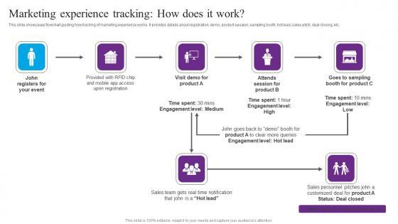 This slide showcases flowchart guiding how tracking of marketing experience works. It provides details about registration, demo, product session, sampling booth, hot lead, sales pitch, deal closing, etc. Whether you have daily or monthly meetings, a brilliant presentation is necessary. Marketing Experience Tracking Centric Marketing To Enhance Brand Connections Icons Pdf can be your best option for delivering a presentation. Represent everything in detail using Marketing Experience Tracking Centric Marketing To Enhance Brand Connections Icons Pdf and make yourself stand out in meetings. The template is versatile and follows a structure that will cater to your requirements. All the templates prepared by Slidegeeks are easy to download and edit. Our research experts have taken care of the corporate themes as well. So, give it a try and see the results. This slide showcases flowchart guiding how tracking of marketing experience works. It provides details about registration, demo, product session, sampling booth, hot lead, sales pitch, deal closing, etc.