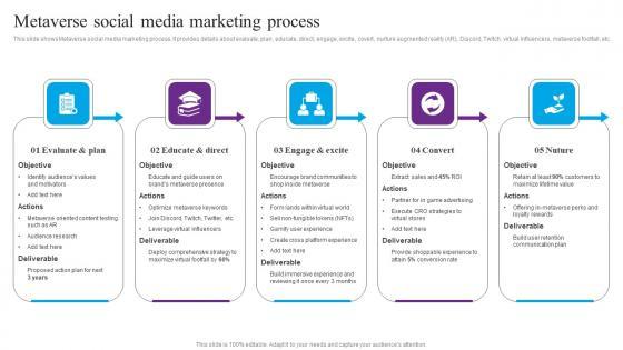 This slide shows Metaverse social media marketing process. It provides details about evaluate, plan, educate, direct, engage, excite, covert, nurture augmented reality AR, Discord, Twitch, virtual influencers, metaverse footfall, etc. If your project calls for a presentation, then Slidegeeks is your go to partner because we have professionally designed, easy to edit templates that are perfect for any presentation. After downloading, you can easily edit Metaverse Social Media Marketing Centric Marketing To Enhance Brand Connections Information Pdf and make the changes accordingly. You can rearrange slides or fill them with different images. Check out all the handy templates This slide shows Metaverse social media marketing process. It provides details about evaluate, plan, educate, direct, engage, excite, covert, nurture augmented reality AR, Discord, Twitch, virtual influencers, metaverse footfall, etc.