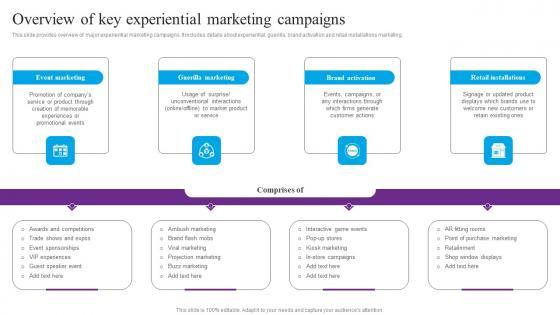 This slide provides overview of major experiential marketing campaigns. It includes details about experiential, guerilla, brand activation and retail installations marketing. Make sure to capture your audiences attention in your business displays with our gratis customizable Overview Of Key Experiential Centric Marketing To Enhance Brand Connections Information Pdf. These are great for business strategies, office conferences, capital raising or task suggestions. If you desire to acquire more customers for your tech business and ensure they stay satisfied, create your own sales presentation with these plain slides. This slide provides overview of major experiential marketing campaigns. It includes details about experiential, guerilla, brand activation and retail installations marketing.