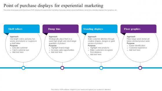 This slide showcases point of purchase POP displays for experiential marketing. It provides details about shelf talkers, dump bins, standing displays, floor graphics, etc. Coming up with a presentation necessitates that the majority of the effort goes into the content and the message you intend to convey. The visuals of a PowerPoint presentation can only be effective if it supplements and supports the story that is being told. Keeping this in mind our experts created Point Of Purchase Displays Centric Marketing To Enhance Brand Connections Formats Pdf to reduce the time that goes into designing the presentation. This way, you can concentrate on the message while our designers take care of providing you with the right template for the situation. This slide showcases point of purchase POP displays for experiential marketing. It provides details about shelf talkers, dump bins, standing displays, floor graphics, etc.