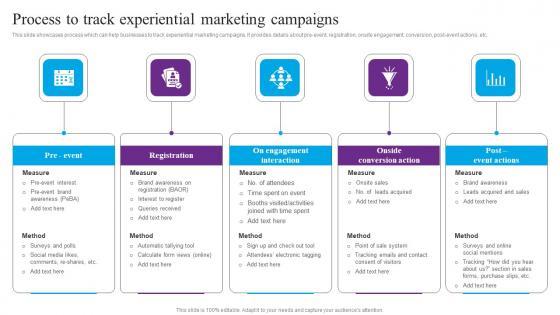 This slide showcases process which can help businesses to track experiential marketing campaigns. It provides details about pre event, registration, onsite engagement, conversion, post event actions, etc. Are you searching for a Process To Track Experiential Centric Marketing To Enhance Brand Connections Ideas Pdf that is uncluttered, straightforward, and original Its easy to edit, and you can change the colors to suit your personal or business branding. For a presentation that expresses how much effort you have put in, this template is ideal With all of its features, including tables, diagrams, statistics, and lists, its perfect for a business plan presentation. Make your ideas more appealing with these professional slides. Download Process To Track Experiential Centric Marketing To Enhance Brand Connections Ideas Pdf from Slidegeeks today. This slide showcases process which can help businesses to track experiential marketing campaigns. It provides details about pre event, registration, onsite engagement, conversion, post event actions, etc.