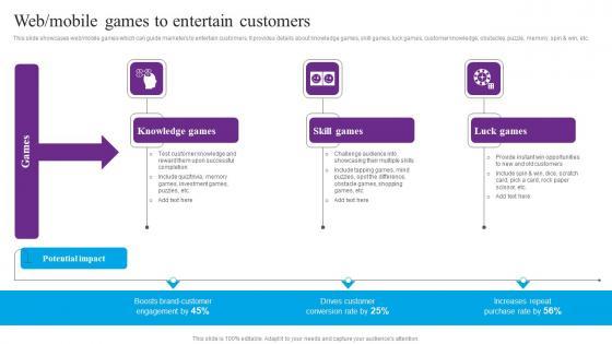 This slide showcases web mobile games which can guide marketers to entertain customers. It provides details about knowledge games, skill games, luck games, customer knowledge, obstacles, puzzle, memory, spin and win, etc. Get a simple yet stunning designed Web Mobile Games To Centric Marketing To Enhance Brand Connections Clipart Pdf. It is the best one to establish the tone in your meetings. It is an excellent way to make your presentations highly effective. So, download this PPT today from Slidegeeks and see the positive impacts. Our easy to edit Web Mobile Games To Centric Marketing To Enhance Brand Connections Clipart Pdf can be your go to option for all upcoming conferences and meetings. So, what are you waiting for Grab this template today. This slide showcases web mobile games which can guide marketers to entertain customers. It provides details about knowledge games, skill games, luck games, customer knowledge, obstacles, puzzle, memory, spin and win, etc.
