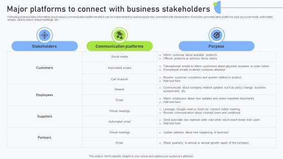 Following slide provides information about various communication platforms which can be implemented by businesses to stay connected with stakeholders. It includes communication platforms such as social media, automated emails, calls to action, virtual meetings, etc. Explore a selection of the finest Relationship Management Automation Major Platforms To Connect With Business Stakeholders here. With a plethora of professionally designed and pre-made slide templates, you can quickly and easily find the right one for your upcoming presentation. You can use our Relationship Management Automation Major Platforms To Connect With Business Stakeholders to effectively convey your message to a wider audience. Slidegeeks has done a lot of research before preparing these presentation templates. The content can be personalized and the slides are highly editable. Grab templates today from Slidegeeks. Following slide provides information about various communication platforms which can be implemented by businesses to stay connected with stakeholders. It includes communication platforms such as social media, automated emails, calls to action, virtual meetings, etc.