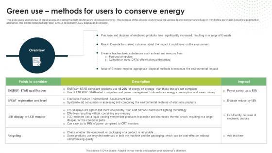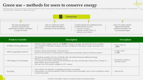 This slide gives an overview of green usage, including the methods for users to conserve energy. The purpose of this slide is to showcase the various tips for consumers to keep in mind while purchasing electric equipment or appliance. The points include Energy Star, EPEAT registration, LED display and recycling. Here you can discover an assortment of the finest PowerPoint and Google Slides templates. With these templates, you can create presentations for a variety of purposes while simultaneously providing your audience with an eye-catching visual experience. Download Sustainable Green Use Methods For Users To Conserve Energy to deliver an impeccable presentation. These templates will make your job of preparing presentations much quicker, yet still, maintain a high level of quality. Slidegeeks has experienced researchers who prepare these templates and write high-quality content for you. Later on, you can personalize the content by editing the Sustainable Green Use Methods For Users To Conserve Energy. This slide gives an overview of green usage, including the methods for users to conserve energy. The purpose of this slide is to showcase the various tips for consumers to keep in mind while purchasing electric equipment or appliance. The points include Energy Star, EPEAT registration, LED display and recycling.