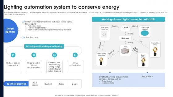 This slide provides an overview of the smart lighting automation system used in homes to enhance user experience. The slide covers working, technologies used and advantages that are it reduces cost, allows customization and controls the system remotely. Whether you have daily or monthly meetings, a brilliant presentation is necessary. Optimization Of IoT Remote Monitoring Lighting Automation System To Conserve Energy IoT SS V can be your best option for delivering a presentation. Represent everything in detail using Optimization Of IoT Remote Monitoring Lighting Automation System To Conserve Energy IoT SS V and make yourself stand out in meetings. The template is versatile and follows a structure that will cater to your requirements. All the templates prepared by Slidegeeks are easy to download and edit. Our research experts have taken care of the corporate themes as well. So, give it a try and see the results. This slide provides an overview of the smart lighting automation system used in homes to enhance user experience. The slide covers working, technologies used and advantages that are it reduces cost, allows customization and controls the system remotely.