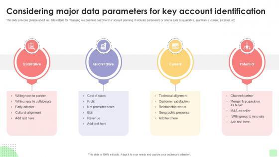 This slide provides glimpse about key data criteria for managing key business customers for account planning. It includes parameters or criteria such as qualitative, quantitative, current, potential, etc. Ditch the Dull templates and opt for our engaging Considering Major Data Detailed Business Account PPT PowerPoint Strategy SS V deck to attract your audience. Our visually striking design effortlessly combines creativity with functionality, ensuring your content shines through. Compatible with Microsoft versions and Google Slides, it offers seamless integration of presentation. Save time and effort with our pre-designed PPT layout, while still having the freedom to customize fonts, colors, and everything you ask for. With the ability to download in various formats like JPG, JPEG, and PNG, sharing your slides has never been easier. From boardroom meetings to client pitches, this deck can be the secret weapon to leaving a lasting impression. This slide provides glimpse about key data criteria for managing key business customers for account planning. It includes parameters or criteria such as qualitative, quantitative, current, potential, etc.