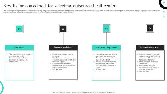 The following slide highlights key points like cost saving, language proficiency, time zone compatibility, technical infrastructure to show key factor considered for selecting offshore call center. It helps organizations to understand factors to consider to select offshore call center to lead cost savings and improved customer support. Showcasing this set of slides titled Key Factor Considered For Selecting Outsourced Call Center Download Pdf. The topics addressed in these templates are Language Proficiency, Time Zone Compatibility, Technical Infrastructure. All the content presented in this PPT design is completely editable. Download it and make adjustments in color, background, font etc. as per your unique business setting. The following slide highlights key points like cost saving, language proficiency, time zone compatibility, technical infrastructure to show key factor considered for selecting offshore call center. It helps organizations to understand factors to consider to select offshore call center to lead cost savings and improved customer support.