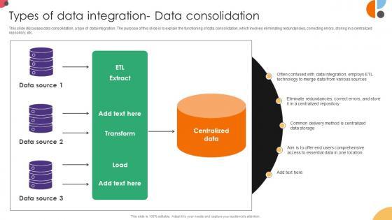 This slide discusses data consolidation, a type of data integration. The purpose of this slide is to explain the functioning of data consolidation, which involves eliminating redundancies, correcting errors, storing in a centralized repository, etc. Are you in need of a template that can accommodate all of your creative concepts This one is crafted professionally and can be altered to fit any style. Use it with Google Slides or PowerPoint. Include striking photographs, symbols, depictions, and other visuals. Fill, move around, or remove text boxes as desired. Test out color palettes and font mixtures. Edit and save your work, or work with colleagues. Download Types Of Data Integration Data Consolidation Data Integration Strategies For Business and observe how to make your presentation outstanding. Give an impeccable presentation to your group and make your presentation unforgettable. This slide discusses data consolidation, a type of data integration. The purpose of this slide is to explain the functioning of data consolidation, which involves eliminating redundancies, correcting errors, storing in a centralized repository, etc.